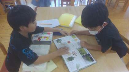 総合「こころ」の学習で、京都御苑にある母と子の森に出かけ、たくさんの自然と触れ合い、そこから不思議だと感じた「謎」を解決するために、学習の計画を立てました。「まずは自分たちの力で調べてみたい」という意見から学校にある読書センターで調べることになりました。最初はなかなか自分の調べたいことにぴったりの本を探すことに苦労する姿もありましたが、実際に本を手に取って開いてみるうちに、調べたいことに合う本を見つけて、調べ学習を進めることができるようになってきました。今週はさらに、そこから「もっとくわしくなりたいこと」を話し合い、御所の森の「木」「葉・花」「きのこ」「動物」について調べていくことになりました。これから、御所の森について、さらに詳しくなるために学習を進めていきます。