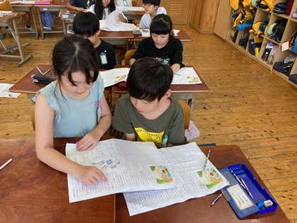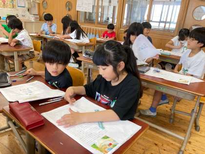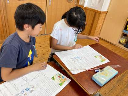 国語科「まいごのかぎ」では物語を読んで、不思議に感じたことをクラスで出し合い、それを読み進めることによって解決していく学習をしています。かぎがきっかけで起こる4つの出来事を整理したり、登場人物のりいこの心情を想像したりしながら学習を進めてきました。みんなで出し合った疑問に対しては、教科書の本文にある言葉を手掛かりに、「りいこの気持ちがしょんぼりからうれしいに変わった理由は〜」「きっと、りいこの描いたうさぎが最後に出てきてくれたのは〜」など、読んだことから想像を広げて考えることができました。