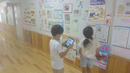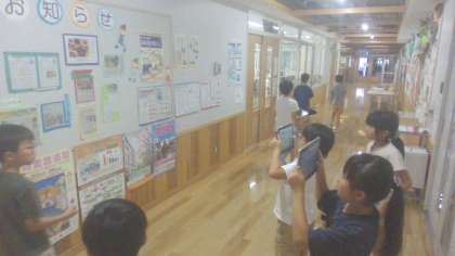 国語科「ポスターを読もう」の学習をしています。ポスターとは、知らせたい内容を言葉と写真、絵を効果的に取り入れ、1枚の紙にまとめたものであると学びました。そして、実際に学校中にどんなポスターが貼られているのかを探しに行くと、お祭りのポスターや交通安全の注意を呼び掛けるポスターなど、たくさんのポスターを見つけることができました。「言葉だけではなく、絵や写真があると興味をもって見てもらえるね。」と、ポスターのよさを見つけることができました。教科書では、同じイベントの内容を伝える2種類のポスターを比べることによって、写真や文字の伝える効果について考えることができました。