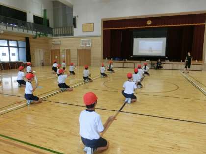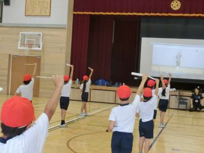 民謡「エイサー」の踊りを体育館で踊っていました。