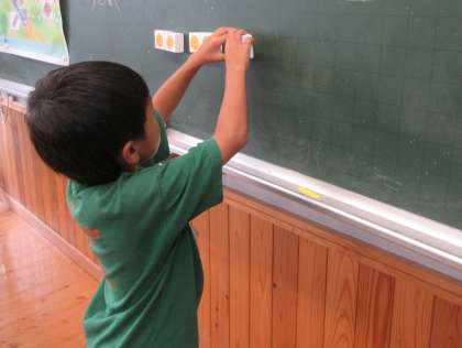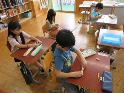 何人のっているかな?(2年) 公開日 2024/09/19 更新日 2024/09/19 2年生 今週からかけ算の学習が始まりました。教科書の絵を見ながら、どの乗り物に何人が乗っているかを数図ブロックを使って調べました。2人ずつ乗っている乗り物、5人ずつ乗っている乗り物など、人数をよく見ながら並べることができました。「2の5つ分だから…10だ!」「これは乗っている数がバラバラだから何かのいくつ分では表せないね」とペアの友達と話し合いながら活動していました。