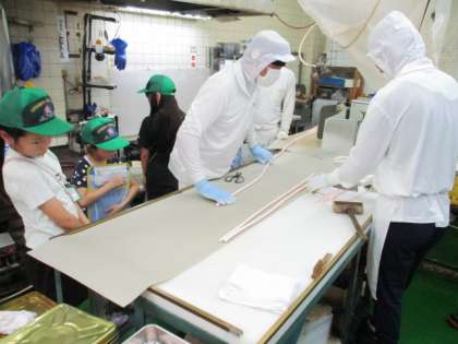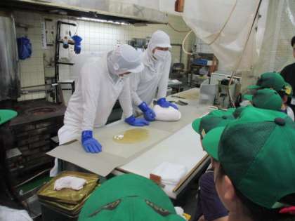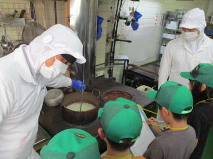 19日(木)・20日(金)に社会科「工場でつくられるもの」の学習で、「京あめ処 豊松堂」さんにご協力いただき、千歳あめが作られている工場の様子を見せていただきました。子どもたちは見学を前に本物の千歳あめを見たり、粘土でまねをして作ってみたりしながら工程や働く人の様子を予想しました。「形が全部同じでこんなにきれいなんだから、きっと型のようなものにはめているんだよ」「機械を使っていると思う」「働く人は20人くらいいるのかな」という子どもたちの予想に反して、たったの5人という少ない人数で、ほとんどすべて手作業であめを作られている姿に大変驚いた様子でした。また、少しでもかけたり割れたりした商品は、「お祝いの場にふさわしくない」ということで売り物にしないことや、こだわりをもってあめづくりをしているという職人さんの思いも聞かせていただきました。