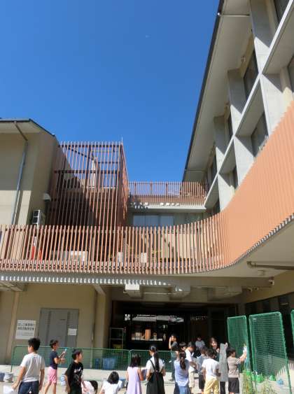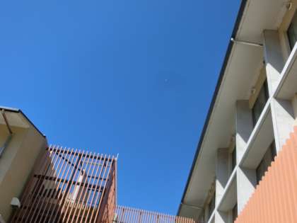 朝のすがすがしい青空を子どもたちが眺めています。