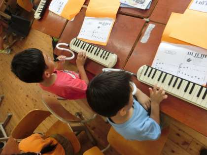 子どもたちがそれぞれ鍵盤ハーモニカの練習に取り組んでいました。