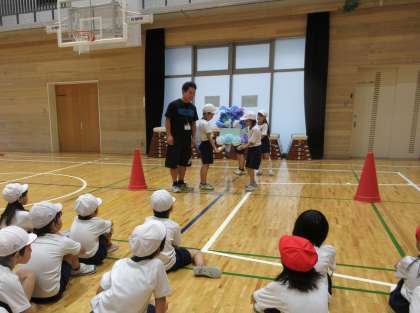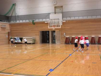 きずなスポーツフェスティバルで行うお神輿リレーの練習をしました。各クラスで飾りつけをしたお神輿を4人1グループで運びます。とても慎重に運んでいるグループもあれば、スピードにのって一気に進んでいるグループもありました。「落ちないように進みたいけど、スピードも出したいな」「せーのっ!で持ち上げようね」と意見を出し合いながらグループで運び方について考えていました。
