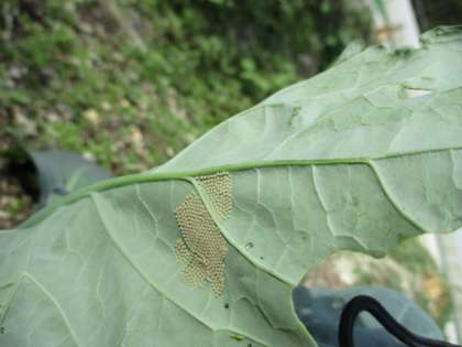 あおむしやバッタなど、葉っぱを食べてしまう”お客さん”がいないかなあ、と葉っぱを裏返して見てみると・・小さい”何か”がきれいに並んでいます。