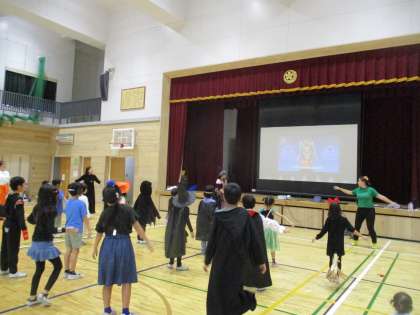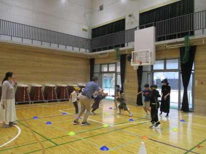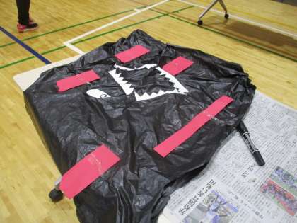 体育館では、仮装グッズを作り、おばけなどになりきりダンシング。