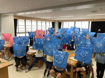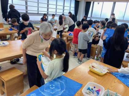 京鹿の子絞に学ぶ 京都のよさ2(3年) 公開日 2024/10/23 更新日 2024/10/23 3年生 伝統工芸師の皆さんのやさしい言葉がけや技術に感動しながら、子どもたちも一生懸命取り組みました。手取り足取り教えていただきながら、伝統工芸を通して京都のよさを自分の手で体験できる素晴らしい機会になりました。