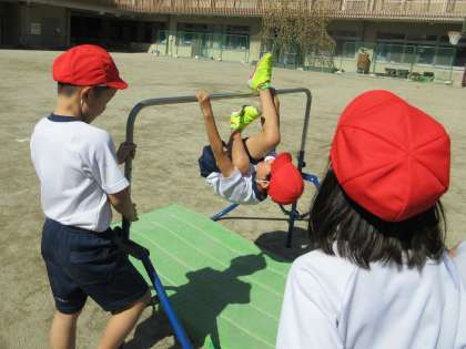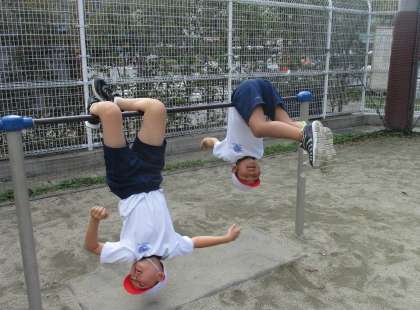 きずなスポーツフェスティバルが終わってから、体育科の学習では「てつぼうあそび」に取り組んでいます。いろいろな遊び方がある中で、特に「ちきゅうまわり」という遊び方が人気なようで「今日は〇周できた!」「あと半周で新記録だったのに」と何度もチャレンジしています。得意な人にお手本を見せてもらったり、同じグループの人とアドバイスをしあったりしながら、一つでもできる遊びを増やそうと協力して頑張っています。