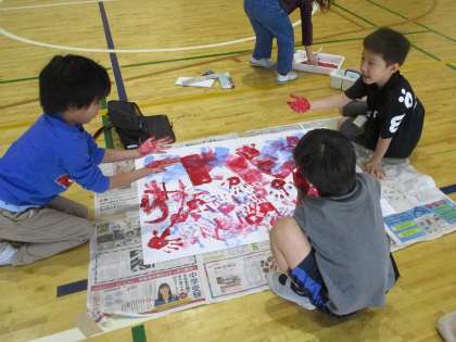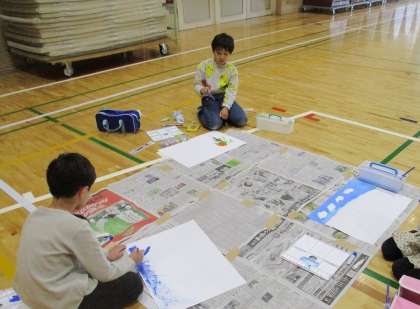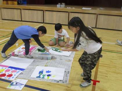 図画工作科の学習で、絵の具を使っていろいろな模様や絵を描きました。水の量を変えると、触り心地はどのように変わるのか、筆での塗り心地は違うのかなどを確かめながら描いていました。