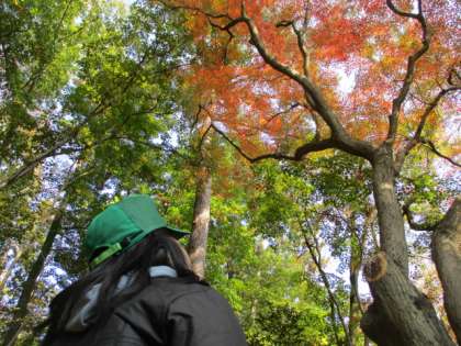 生活単元学習では、「秋」を探しに御所の森へ散策に出かけました。町の木々はまだまだ緑が多いように思いますが、御所の森に分け入ると、赤・黄色・オレンジ・・木々の葉が様々な色に色づき始めているところを目の当たりにすることができました。