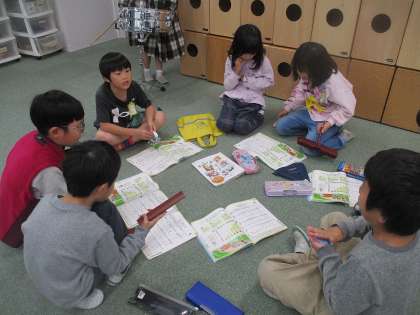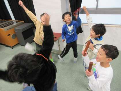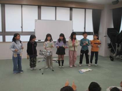 音楽科「いろいろながっきの音をさがそう」の学習で、打楽器の演奏を聴いたり、実際に演奏したりしています。演奏を聴く中で「ウッドブロックやクラベスは短い音だけど、トライアングルは音が伸びているよ」「木でできた楽器は短い音なのかも」と気付いたことを交流しました。演奏したときにはグループごとに楽器の演奏の仕方を工夫して楽しみながら演奏することができました。