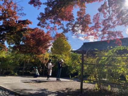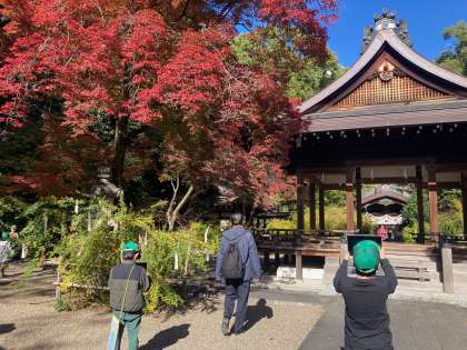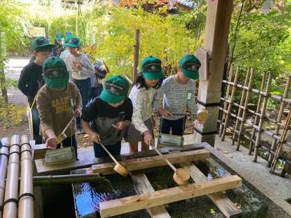梨木神社さんでは、境内を見学させてもらいました。境内の木々は赤く色づき、美しい景色に子どもたちは感動していました。季節ごとに変わる美しい萩やもみじについてや明治時代から大切に手入れをしてきた建物について見学しました。自然だけでなく京都三名水の染井の井戸のお水をいただき、そのおいしさに驚いていました。紅葉の時期も大変美しいですが、萩の名所ということで、子どもたちは「萩の咲く季節にもまた来たいな」と話していました。