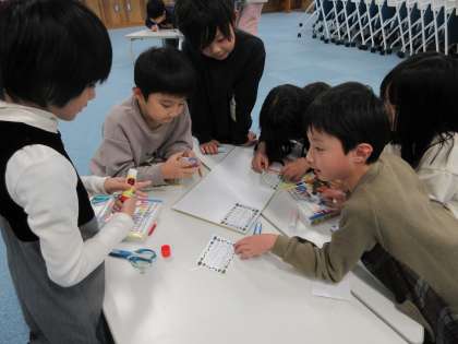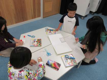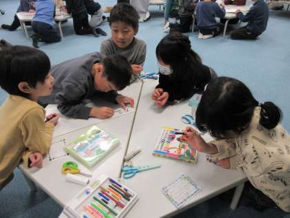 無事にお店や施設でのインタビューを終え、御所東のまちの自慢をそれぞれが見つけることができました。インタビューは終わったものの、このままでいいのかと子どもたちに問いかけると「お礼を伝えた方がいい」「お手紙でありがとうの気持ちを伝えよう」という話になりました。そこで、子どもたち一人一人がインタビューでお世話になったお店や施設の方へメッセージを書きました。写真は各グループでそのメッセージを色紙に貼り、飾りつけをしている様子です。グループで協力して、クーピーでカラフルに色をつけたり、折り紙で作った切り絵を貼り付けたりと、感謝の気持ちが伝わるよう色紙を作りました。
