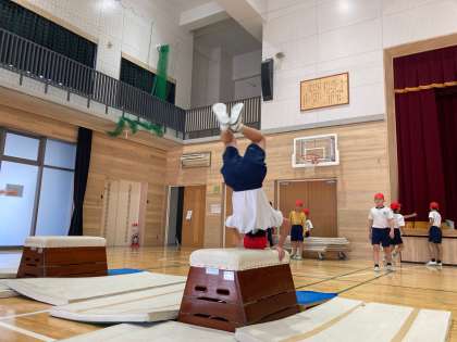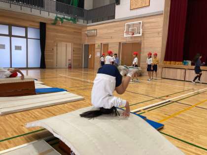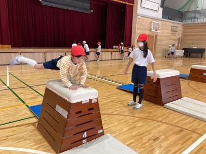 体育科の学習では『とび箱運動』を行ってきました。毎回1時間の授業の中で、前半は『少しがんばればできそうな技に挑戦する』というねらいで取り組み、後半は『今できる技で、高さや着地の距離に挑戦する』というねらいで、台上前転やかかえこみとび、ダイナミックに回転する首はねとびに挑戦しています。最初は怖くてなかなか跳べなかった人が、台上前転やかかえこみとびに挑戦し、どんどん成功することができています。また『コツ分かった!』と、どんどん段数を増やしていく姿も見られました。