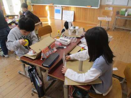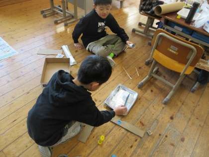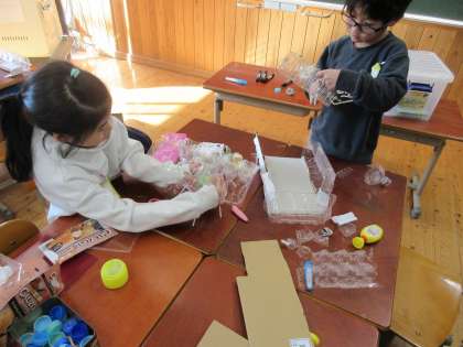 図画工作科では「ともだちハウス」の学習をしました。まずはじめに、自分だけのお友達を石やペットボトルキャップなどを使って作りました。どのお友達もえがおがすてきなかわいらしい顔をしていました。次に、お友達が楽しめるお家を、様々な材料を組み合わせて作りました。「ハンモックで休めるようにしよう!」「帰ってきたらきっとお風呂に入りたいはずだ」などお友達のことを考えて工夫を凝らしていました。