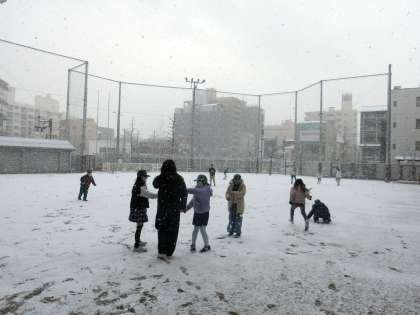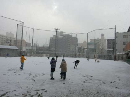 子どもたちは、雪を丸めたり、小さな雪だるまをつくったり
