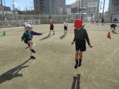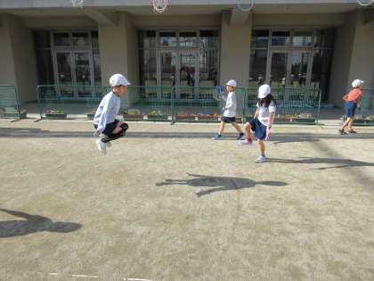 体育科「なわとび」(2年) 公開日 2025/01/10 更新日 2025/01/10 2年生 体育科で「なわとび」の学習が始まりました。1年生のときに比べて取り組む技の種類も増え、ドキドキわくわくの気持ちでスタートしました。跳び始めると、いろいろなところから「10回超えた!」「初めてできた!」と喜びの声が聞こえてきました。休み時間に運動場で練習している人もいます。今後の記録更新が楽しみです。