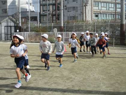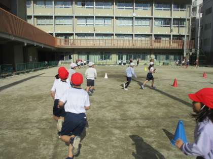 体育科「ゆっくりかけあし」(2年) 公開日 2025/01/10 更新日 2025/01/10 2年生 体育科では「なわとび」の学習と並行して「ゆっくりかけあし」の学習にも取り組んでいます。初回はグループの友達とペースを合わせて、自由にコースを走りました。無理のないペースで走ることが目標なので、グループの友達の様子を先頭の人は確認しながら走りました。