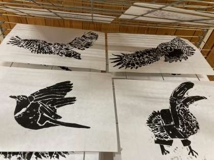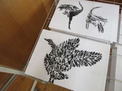 図画工作科「いろいろうつして」で制作してきた鳥の版を使って、和紙に刷る活動を行いました。画用紙を使って迫力のある翼・羽など体の一つ一つのパーツにこだわって制作したものが、しっかり和紙に写るようにしっかり丁寧に刷りました。これから思い思いの色を和紙に、にじませて完成を目指していきます。3月にある図工展に展示する予定です。