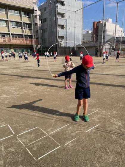 2年生の体育では「なわとび・ジョギング」に取り組んでいます。「なわとび」では、前跳び・グーパー跳び・片足跳び・走り跳び・後ろ跳びなど、様々な跳び方にチャレンジしています。縄の回し方や跳びこし方、タイミングの合わせ方など、それぞれにめあてを設定して取り組んでいます。友達にアドバイスをもらったり、互いの回数を数え合ったりする姿が見られます。
