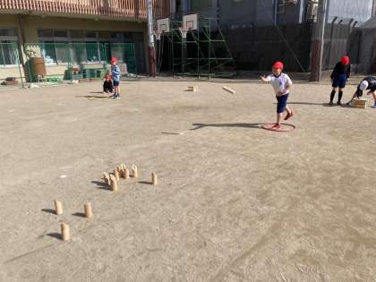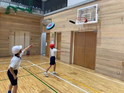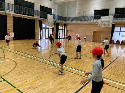 体育科「ようぐ遊び」では、運動場や体育館で学校にある用具を使って体を動かして遊ぶ運動をしています。休み時間や放課後によく使うボールだけでなく、一輪車やタグ(しっぽ)、フラフープや新聞紙、モルックなど、日頃はあまり使わないような用具を使って運動をしました。一人でできる運動もあれば、友だちと協力しなければならない運動もあり、「せーのっ!」と声を合わせたり、「こんなルールで勝負してみない?」と工夫したりして、楽しく用具を使って遊ぶことができました。休み時間や放課後の遊びにも生かされるとよいですね。