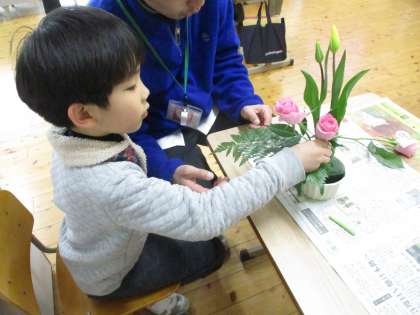 「ここでいいかな…。」と緊張しながら慎重に生ける子、躊躇なく生ける子、使っているお花は同じだけれど、それぞれの個性が光る作品になりました。