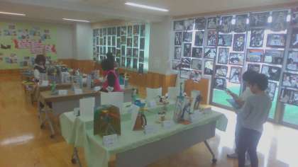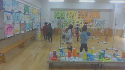 6日(木)の5校時に図工展の鑑賞を行いました。各フロアのオープンスペースには3組、1年生〜6年生までの作品がずらりと並び、まるで学校の中が美術館のようになりました。子どもたちは各学年の作品を見て、「1年生とは思えないぐらいしっかり作ってる!」「6年生はやっぱり細かいところまでていねいに作っていてやっぱりすごいな!」と、さまざまな作品のすてきなところをたくさん見つけていました。