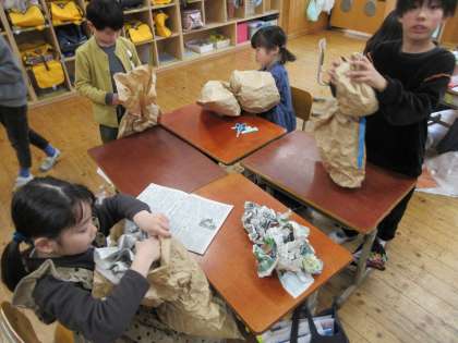 図画工作科「くしゃくしゃぎゅっ」の学習をしました。初めに、紙の袋をくしゃくしゃと丸めてみました。手で丸めたり、体全体を使って紙を抱きしめてみたりと、いろいろな方法でくしゃくしゃにしていました。「音がおもしろい!」「紙が柔らかくなったね」「シワシワになった!」と口々に感想を呟いていました。今度は、くしゃくしゃにした紙袋の中に新聞紙を詰めて、膨らませました。すると「ふわふわしていて気持ちいいね」「クッションみたい」と感触の変化に気付いていました。膨らませた紙袋をひもでしばって、一人一人が作りたいものの形にしていきました。