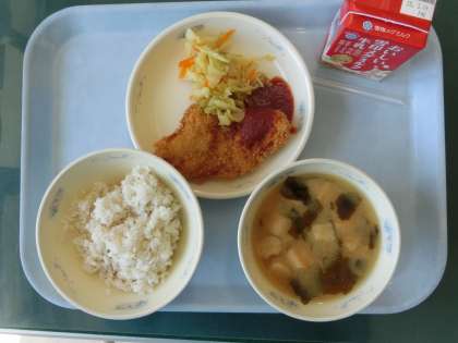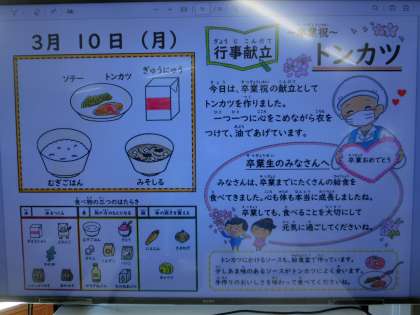 卒業お祝い献立 公開日 2025/03/11 更新日 2025/03/11 6年生 3月10日 卒業お祝い献立でした。 むぎごはん、お味噌汁、とんかつ、野菜のソティ、牛乳でした。 給食調理員さんが、一つ一つ心をこめて、衣をつけ あげてくださいました。 子どもたち、喜んでいました。 たくさんの給食を食べてきました。 これからもしっかりと、バランスよく食べ、体の健康を 大切にしていってほしいと思います。