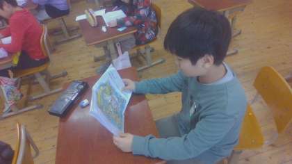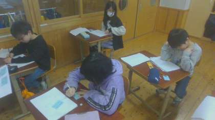 国語科「宝島のぼうけん」で、宝の地図を基に冒険の物語を書く学習を行いました。初め・中・終わりの文章構成を意識しながら、宝箱までの道のりを描く壮大な物語を書きました。中には原稿用紙17枚を超える大作も生まれ、学習の最後にはお互いの物語を読み合い、感想を伝える活動を行いました。「なるほど!そのルートを通るのか!」「トラブルが多すぎて大変だね!」など、お互いの物語のおもしろさや表現の工夫を味わうことができました。