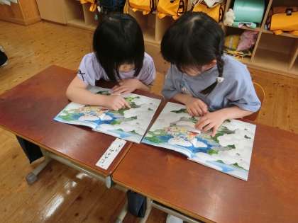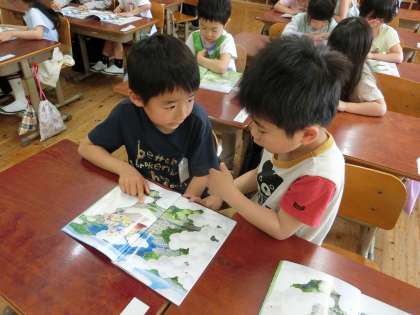 国語科の「はるがきた」の学習で教科書の絵を見ながら、友達とお話しました。「遊園地があるね」「野球場もサッカー場もあるよ」「遠くに見えるタワーは何かな」とペアの友達と楽しくお話できました。