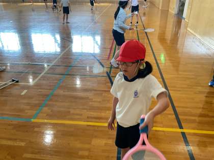 体ほぐしの運動(3組) 公開日 2025/04/25 更新日 2025/04/25 学校の様子 京都御池中学校のアリーナで初めて体育をしました。 指導者と一緒にラケットでシャトルを打ち上げ、床に落とさないように連続で打ち続けると、「お〜〜!!」と歓声をあげていました。 その後は自分でラケットを持ってシャトルを打ち上げて、楽しむことができました。 友達と一緒に体を動かす楽しさを、全身で感じている様子です。