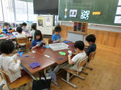 図画工作科「ちょくちょきかざり」 公開日 2025/04/30 更新日 2025/04/30 学校の様子 図画工作科「ちょきちょきかざり」の学習をしました。この学習では主にはさみの使い方を学習します。はさみを使うときの約束を確認し、飾りづくりに臨みました。折った形に切込みを入れたり、切り抜いたりしました。いざ、折り紙を広げてみると、「うわあ!」とあちこちから歓声が聞こえてきました。