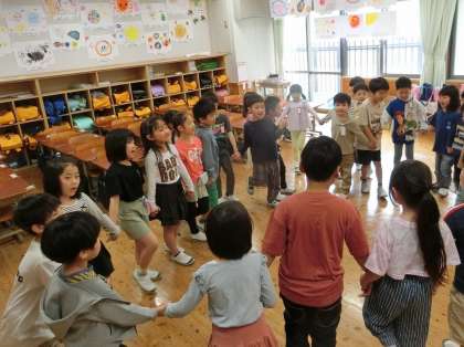 音楽科「うたっておどってなかよくなろう」 公開日 2025/05/13 更新日 2025/05/13 学校の様子 音楽科「うたっておどってなかよくなろう」の学習で「チェッチェッコリ」の曲を歌いながら、ダンスをしました。どんどん早くなる曲に、子どもたちは大盛り上がりでした。また、「ひらいた ひらいた」を歌いながら、歌詞に合わせて動いてみました。みんなで手を繋ぎ、大きく広がったり、小さくすぼんだりして、歌を楽しみました。