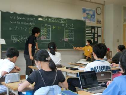 分数÷整数の計算の仕方を考えました。どうしたら、計算できるのかを図を使って考え、意見をみんなで交流していました。「あーなるほど!」「そういうことね!」と友達の説明を聞いてみんなで納得していましたよ。