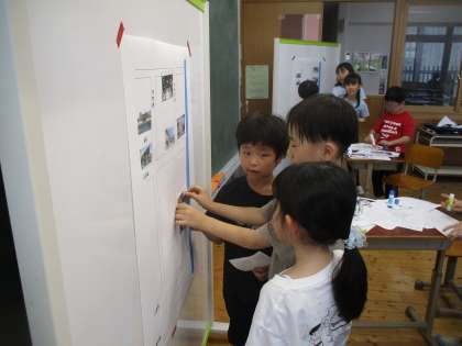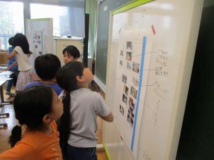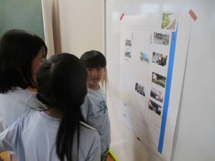 町探検で見つけた御所東の町の「気になる」「びっくり」を交流しました。町探検に行って撮った写真を見せながら、思ったことや気付いたことを交流することを通して、御所東の町には、たくさんのお店があることや知らなかった場所があることに気付くことができました。