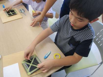 きれいな金色の装飾に魅力を感じた子どもたちは、「金」に詳しい人に話を聞きたいという流れになりました。そこで今日、お招きすることになったのが金箔押し職人の皆さん。金の魅力や装飾する際に考えていることなどを聞かせていただきながら、実際に金箔を押す体験をさせていただきました。