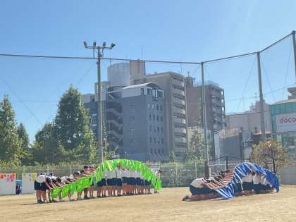 今年度は赤・白・青の三色に分かれて行う競技と、全員で心を一つにして表現する演技の2種目に各学年取り組みました。