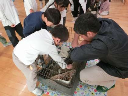 生活科の学習で、お世話をする中で気になったことを、獣医さんに来ていただき、インタビューしました。図鑑ではわからなかったことも丁寧に教えていただき、子どもたちも興味津々で話を聞いていました。また、聴診器を使って、うさぎの心音も聞かせていただき、貴重な体験をすることができました。「ドクドクって音が聞こえるよ」「結構早いね!」と聞いた感想を話していました。ぜひ、ご家庭でも話題にしていただけると幸いです。