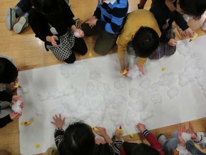 国語科で学習した「くじらぐも」のお話に登場するくじらぐもを、1年1組バージョンも作りたいという思いから、図画工作科の時間にみんなで作りました。友達と力を合わせながら、綿をくじらの形に張り付けて、大きなくじらぐもが完成しました。出来栄えに子どもたちも満足そうな様子で、「本物みたい!」と言っていました。今度はくじらぐもに乗せる人を作る予定です。どんなポーズにするか、実際にやってみながら考えている姿が微笑ましかったです。