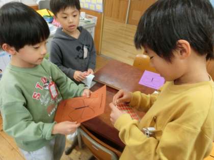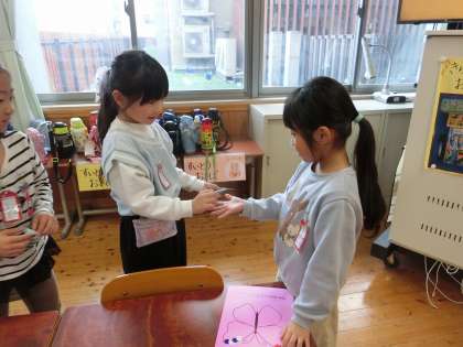 英語活動の学習で、自分だけのちょうちょを作っているときの様子です。これまでに英語での色の言い方や、〇〇, please. Here you are. などやり取りに必要な表現を繰り返し聞いたり、話したりしてきました。それらの表現を使って、お店屋さんごっこをしながら、欲しい色のシールを集めました。積極的に英語でのやり取りをしている人が多く、英語で友達と関わることの楽しさを実感しているようでした。