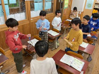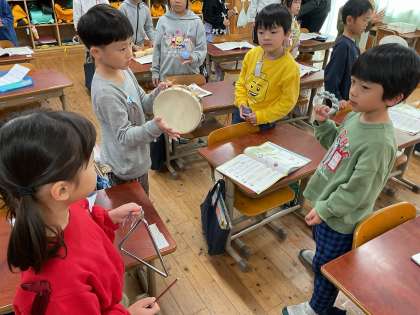 音楽科「がっきとなかよくなろう」(1年) 公開日 2025/12/03 更新日 2025/12/03 学校の様子 音楽科「がっきとなかよくなろう」の学習では、トライアングルやカスタネット、すず、ウッドブロックなどの楽器を使って、好きな演奏の仕方や、音楽にあった演奏の仕方を見つける活動をしています。演奏の仕方によって楽器の音色が変わることに気付き、いろいろな演奏の仕方を試しています。