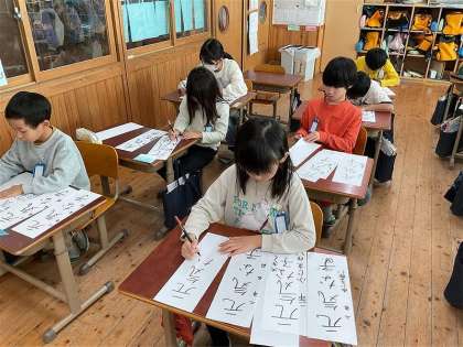 【2年】一画ずつ丁寧に 公開日 2025/12/05 更新日 2025/12/05 学校の様子 書写の学習で、「止め・はね・はらい」を意識しながら、一画ずつ丁寧に書き初め展に向けて、「元気な子」を書きました。静かに集中して、取り組むことができました。