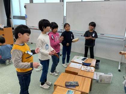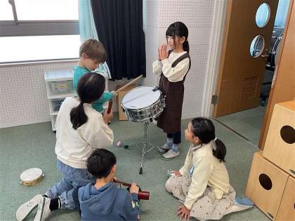 【2年】いろいろながっきの音を組み合わせて 公開日 2025/12/08 更新日 2025/12/08 学校の様子 音楽科「いろいろながっきの音を見つけよう」の学習で、ウッドブロックやカスタネットなど、様々な楽器を使って演奏の練習をしています。「1、2、ハイ」など合図をしながら、練習を頑張っています。
