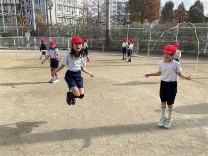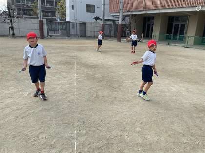 【2年】リズムよく跳ぼう 公開日 2025/12/12 更新日 2025/12/12 学校の様子 「ゆっくりかけあし」の学習と並行して、「なわとび」の学習が始まりました。1年生のときに比べて取り組む技の種類も増え、ドキドキわくわくの気持ちでスタートしました。跳び始めると、いろいろなところから「10回超えた!」「初めてできた!」と喜びの声が聞こえてきました。休み時間に運動場で練習している人もいます。今後の記録更新が楽しみです。