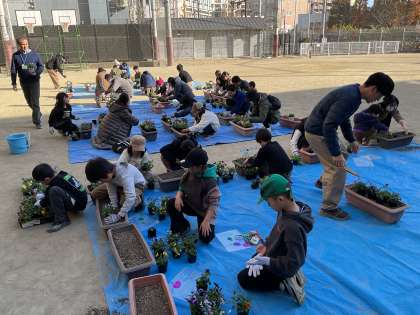 12月13日(土)に、御所東コミュニティ(自然・環境部会)の花いっぱいプロジェクトが行われました。御所東小学校を素敵なお花でいっぱいにするためのこのプロジェクトに、たくさんの子どもと保護者の方が参加しました。