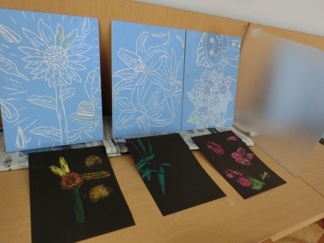 版が出来上がり、絵の具を使って多色刷りを始めています。