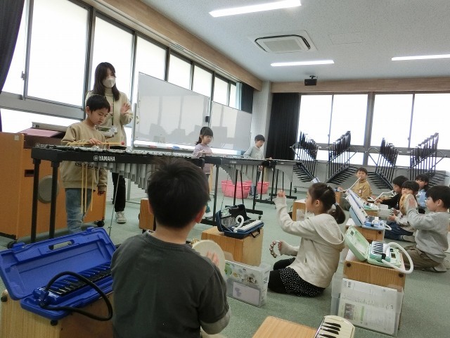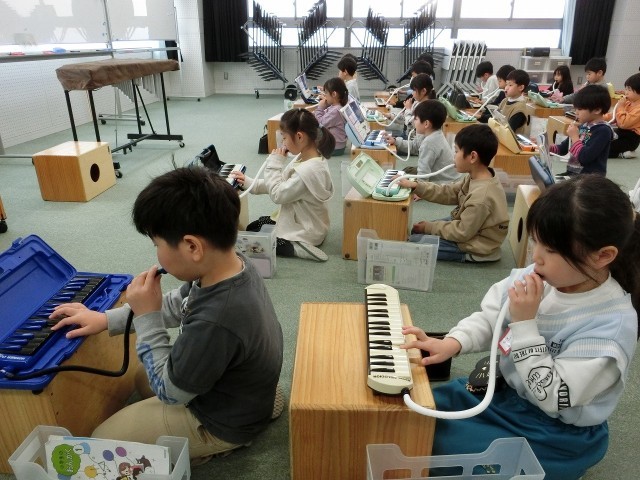今週の音楽の学習では、初めて音楽室に行きました。カホンに座ったり、鉄琴を使って演奏したりと初めて尽くしの学習になりました。子どもたちは終始楽しそうで、いつもより演奏にも気合いが入っているように感じました。演奏後には、「鉄琴の音がきれい」「すごく響くね」と、初登場の鉄琴に夢中な様子でした。