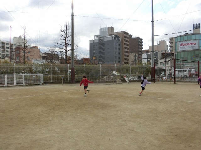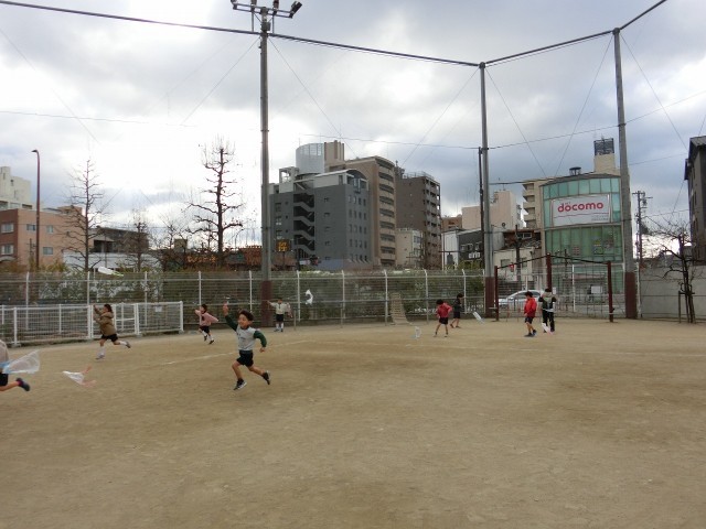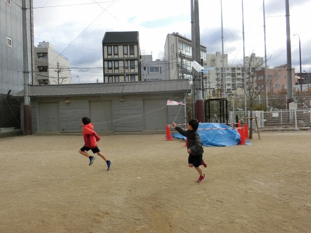 生活科「ふゆとともだち」の学習では、冬をもっともっと楽しむための遊びとして、凧揚げをしました。京都御苑に出かけた際に感じた冬の風の強さや、冬休み中の経験をヒントに凧揚げを企画しました。自分で作った凧を高く揚げようと走ったり、じっとして風が強まる機会を待ってみたりと、どの人も自分の凧を揚げるために一生懸命でした。